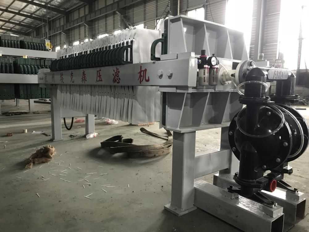 隔膜壓濾機(jī)和常規(guī)箱式壓濾機(jī)的主要區(qū)別在于,在濾板的兩側(cè)都增加了兩個(gè)彈性膜(復(fù)合橡膠膜是一個(gè)整體式膜。在操作期間,當(dāng)進(jìn)料完成時(shí),將高壓流體介質(zhì)注入膜中,并使整個(gè)膜膨脹以過(guò)濾濾餅,以進(jìn)一步使濾餅脫水,這是壓力過(guò)濾。在隔膜壓濾機(jī)運(yùn)行期間,液壓系統(tǒng)使用液壓油作為壓力載體來(lái)傳遞內(nèi)部壓力。